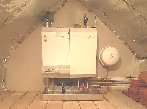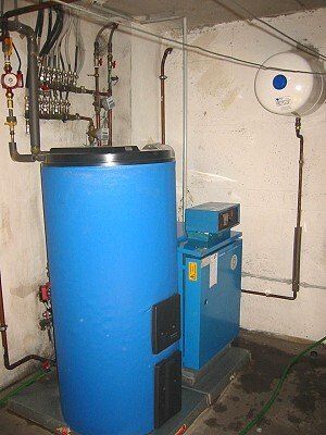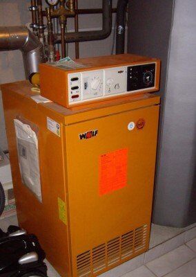 Der alte Viessmann Olkessel, der Solarspeicher und der Röhrenkollektor wurden demontiert. Die Leitungen zum Teil zurück gebaut. Einbau eines Windhager Vergaser-Festbrennstoffkessel 18 kw kombiniert mit einem Junkers Ölheizwertkessel 17 kw und einer Junkers Solaranlage zur Heizungsunterstützung