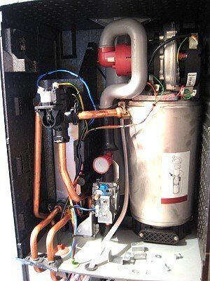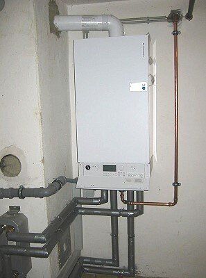 Demontage eines alten Gasheizkessels Viessmann und Einbau einer wandhängenden Gas-Brennwerttherme Viessmann Vitodens 200, Montage des Kaminrohres; Montage eines Plattenwärmetauschers zur Systemtrennung in Heizungsanlagen, da bei der Kundin Fußbodenheizungsrohr verlegt wurde, welches nicht diffusionsdicht (sauerstoffundurchlässig) ist. Der "alte" Warmwasserspeicher konnte erhalten werden.