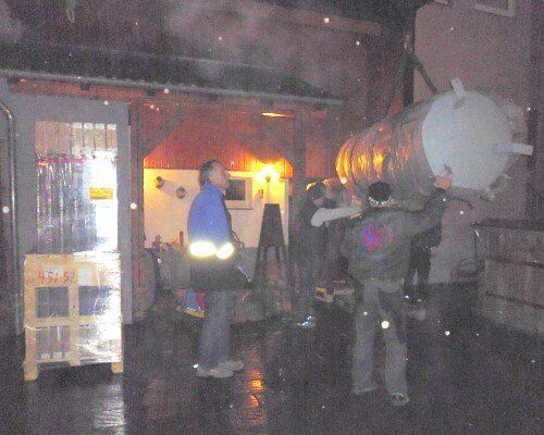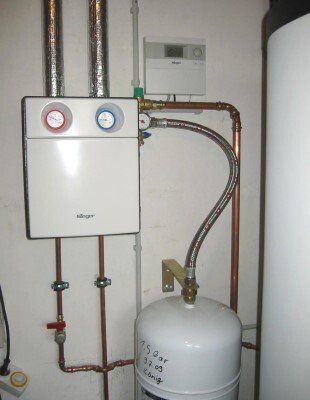 Austausch der bestehenden Ölheizung Wolf qegen eine Dimplex-Wärmepumpe mit 40 KW, einem 500  Pufferspeicher und einem 500   Brauchwasserspeicher. Das Fundament wurde durch den Bauherren im Garten errichtet. Da die Wärmepumpe 600 kg wiegt, musste sie mittels eines Autokrans vom Lkw auf das Fundament verbracht werden. Auch die bestehende Elektroleitung war für den Autokran kein Hindernis.
