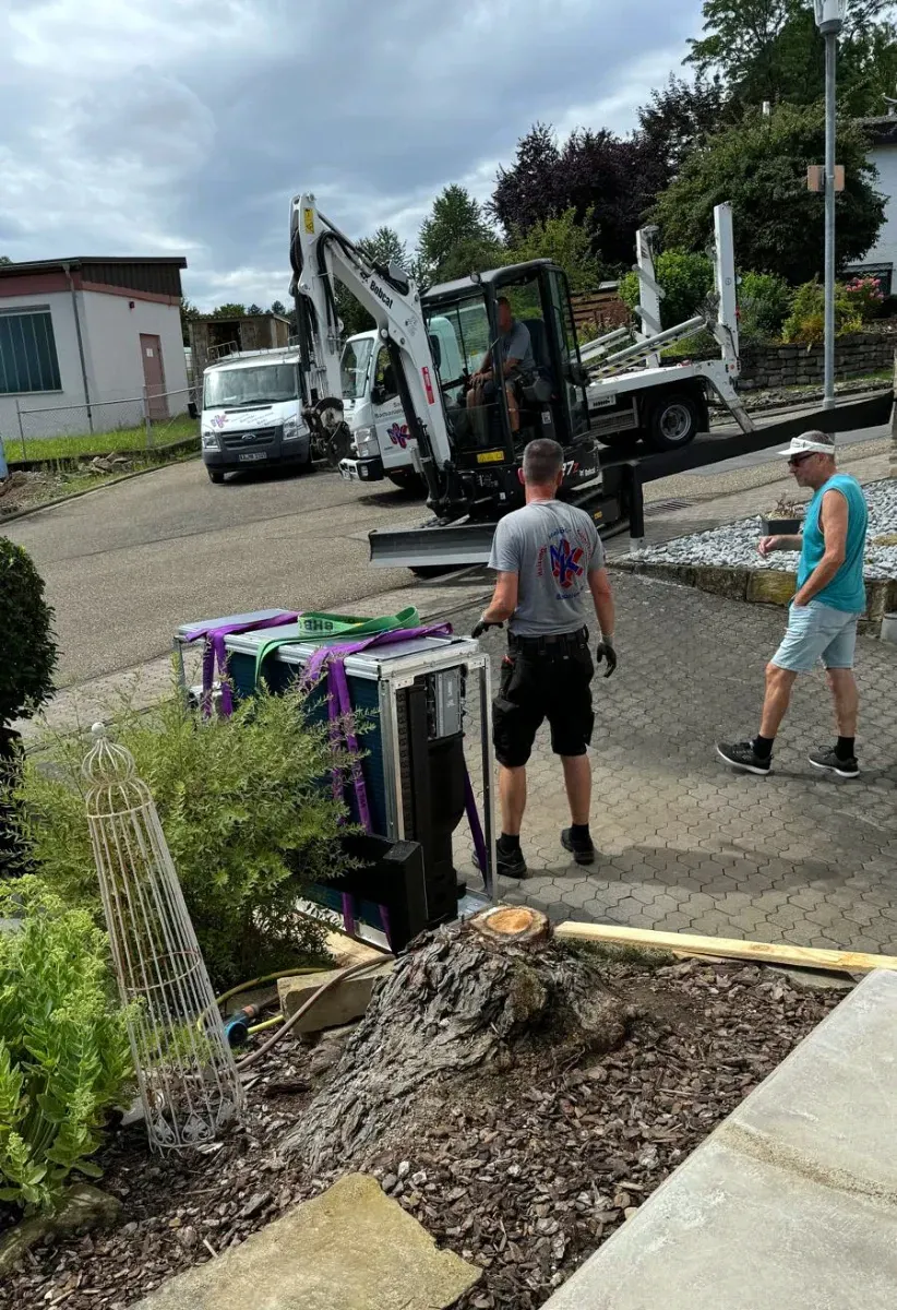 Austausch der bestehenden Ölheizung Wolf qegen eine Dimplex-Wärmepumpe mit 40 KW, einem 500 Pufferspeicher und einem 500 Brauchwasserspeicher. Das Fundament wurde durch den Bauherren im Garten errichtet. Da die Wärmepumpe 600 kg wiegt, musste sie mittels eines Autokrans vom Lkw auf das Fundament verbracht werden. Auch die bestehende Elektroleitung war für den Autokran kein Hindernis.