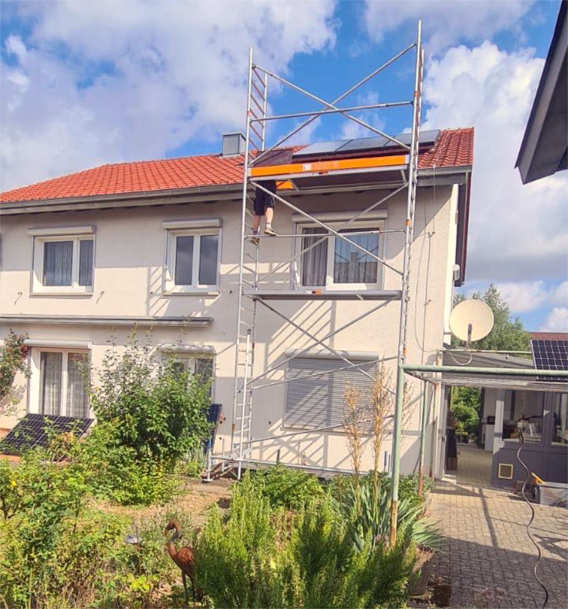Vor Beginn der Arbeiten wurde ein Gerüst sowie ein spezielles Dachgerüst aufgebaut, um den Arbeitern einen sicheren und ergonomischen Zugang zum Dach zu ermöglichen. Die Errichtung des Gerüsts erfolgte gemäß den geltenden Sicherheitsvorschriften und gewährleistete einen reibungslosen und sicheren Ablauf der Montagearbeiten.